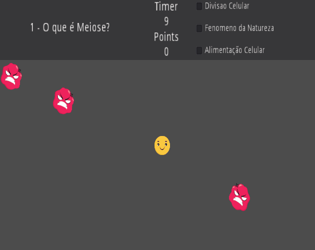 Nesse compendium você vai aprender a criar um simples sistema de perguntas onde o jogador terá três opções para escolher. Se a resposta estiver correta, o jogador tem direito a eliminar três inimigos clicando em cima deles. Caso o tempo acabe ou o jogador erre a resposta, é criado mais inimigos na fase. Se o personagem for tocado pelo inimigo ou o jogador responder todas as perguntas, o jogo acaba.
